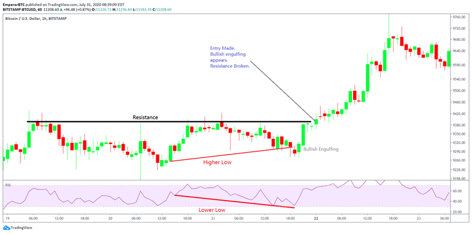 이번엔 캔들 확정과 약한 상승 다이버전스를 바탕으로 이뤄진 또 다른 거래를 보자.