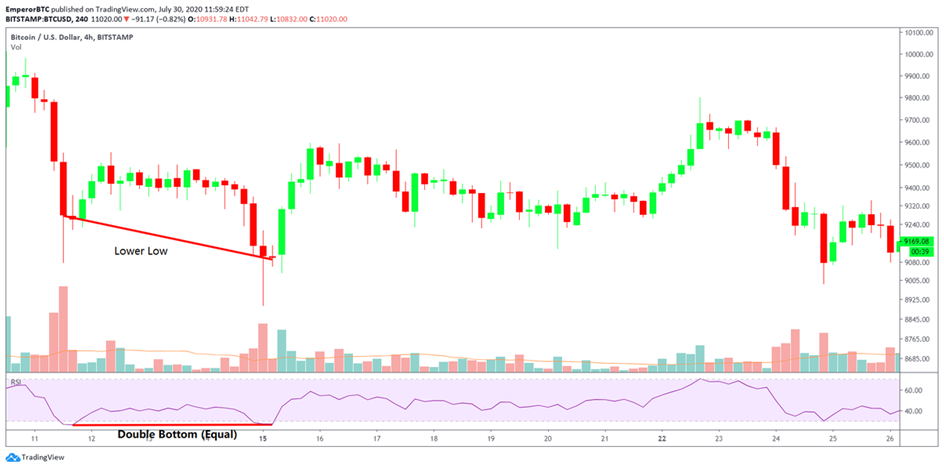 The price makes a double bottom (same level as earlier low) and the oscillator makes a higher low.